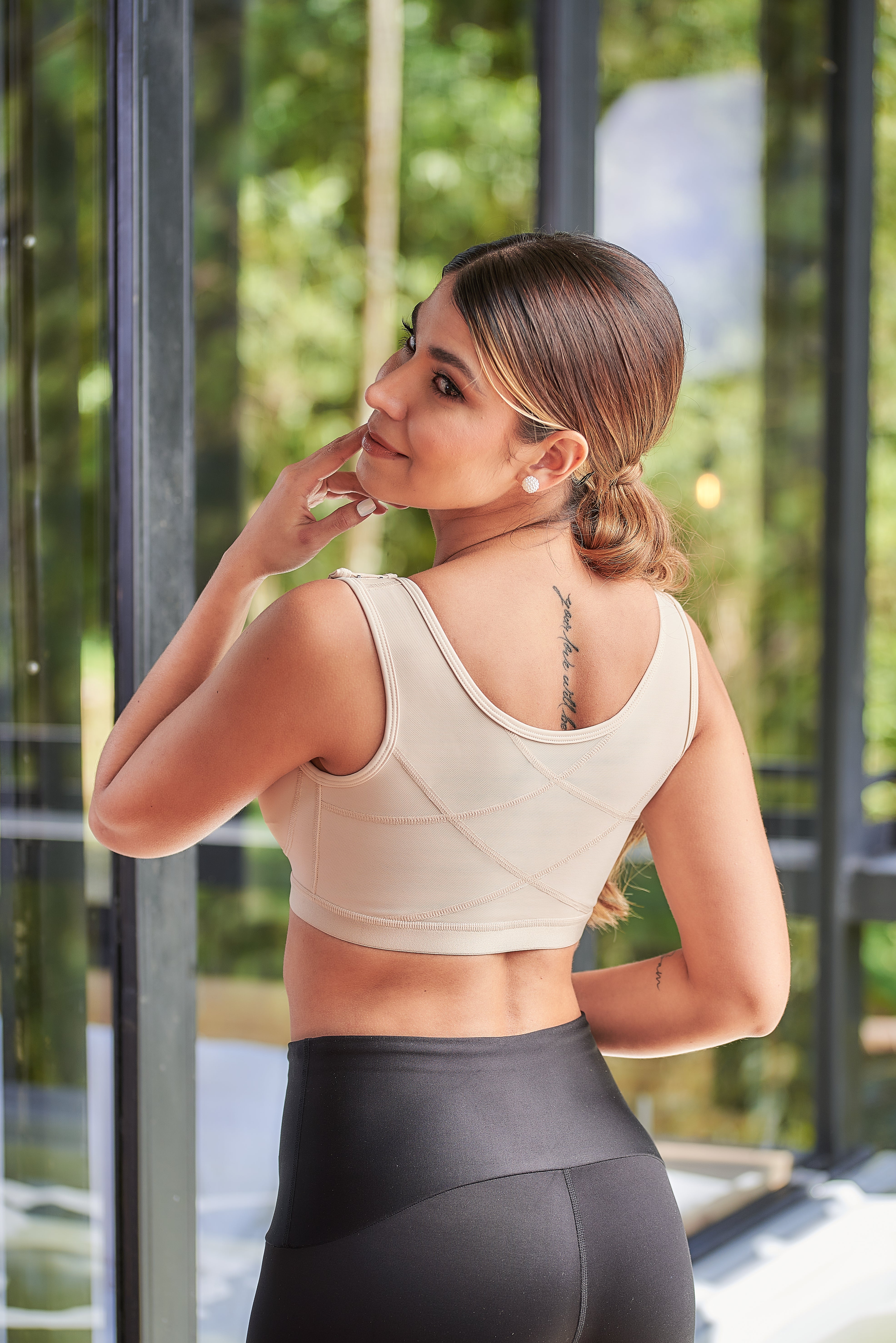 Brasier powernet forrado en lycra, tira ancha con corrector de postura, 2 niveles broche en medio y hombro.