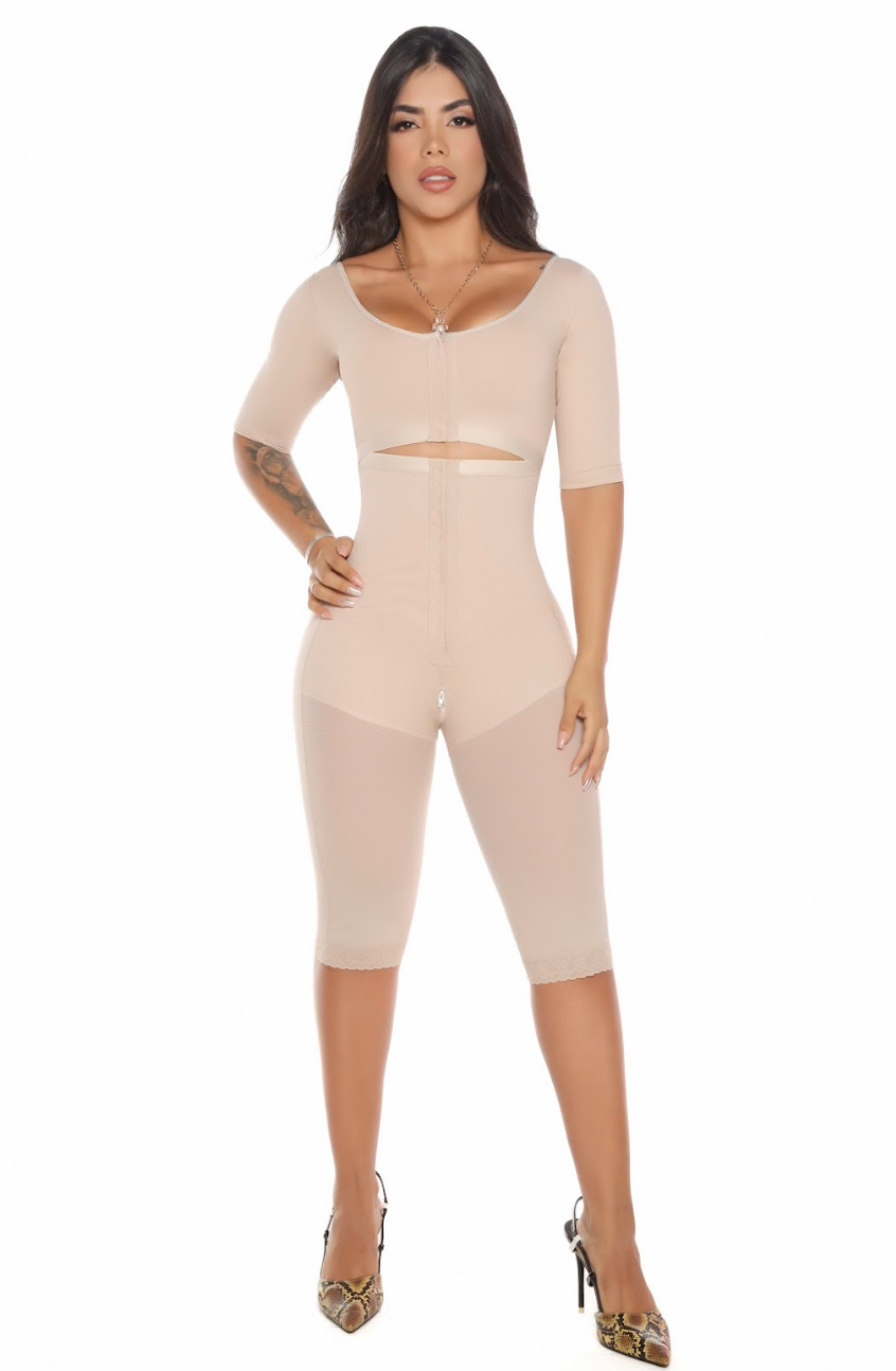 Faja larga con mangas y brasier, 3 niveles de broche, Cierre zona íntima y levantamiento de glúteos.