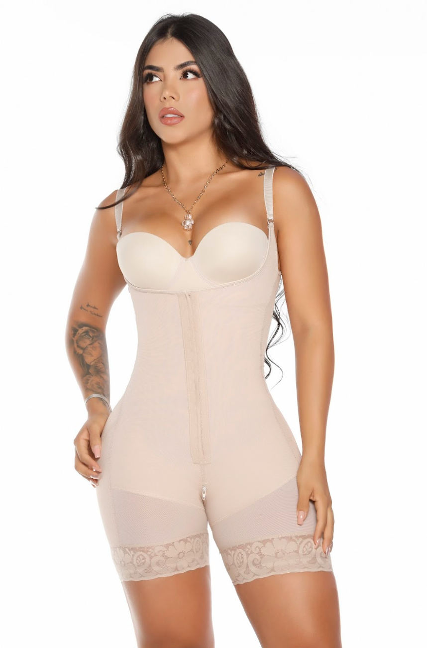 Faja media pierna, senos libres, espalda alta, tiras removibles, 2 niveles de broche, cierre zona íntima y levantamiento de glúteos.
